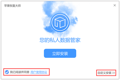軟件安裝包下載完成后,雙擊點開安裝包,跳出安裝界面。默認勾選“我同意用戶協(xié)議”,點擊【自定義安裝】選擇安裝路徑和安裝選項。