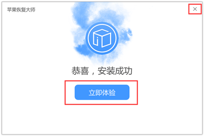 完成安裝后點擊【立即體驗】可以打開蘋果恢復大師開始使用,如當前不需要使用,點擊右上角的【×】關閉界面。